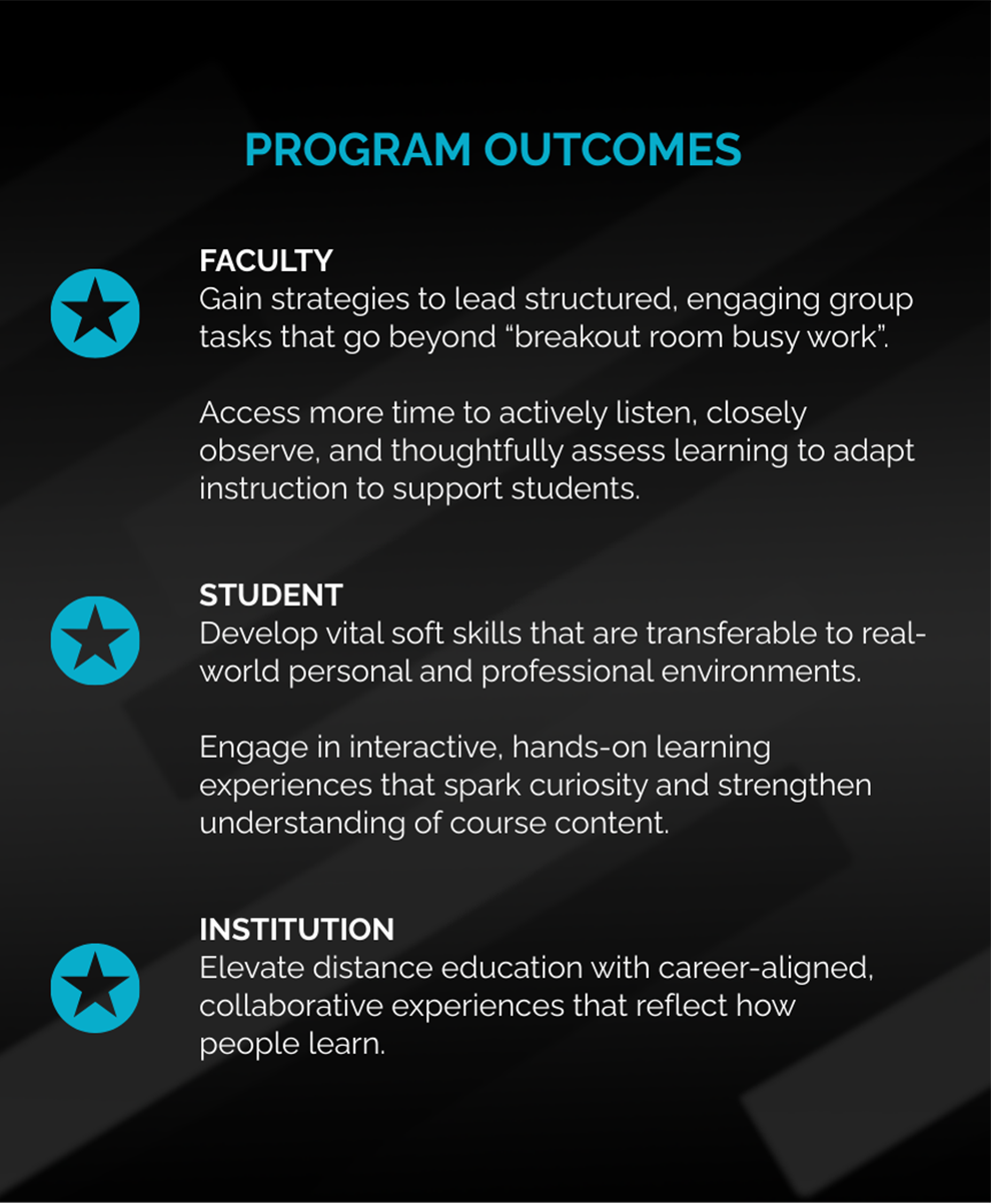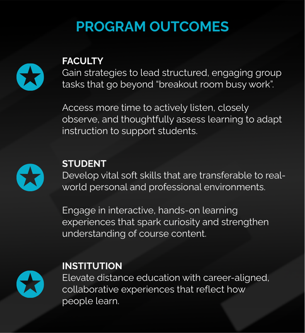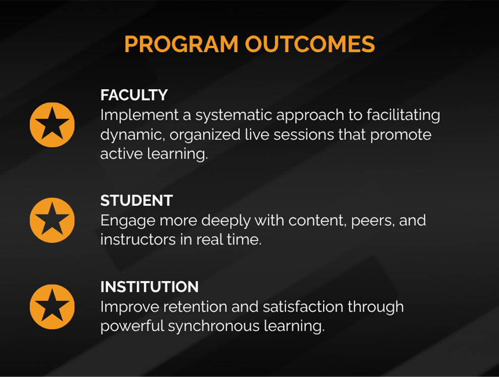 This program equips faculty with four powerful frameworks to design engaging, structured synchronous sessions that drive student success. Build stronger connections, elevate outcomes, and transform online learning into a vibrant, real-time experience that mirrors the best of in-person instruction.